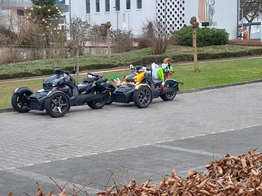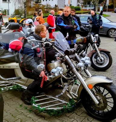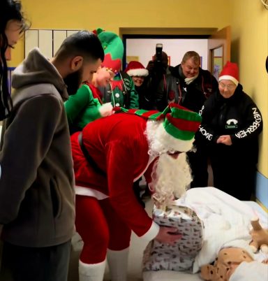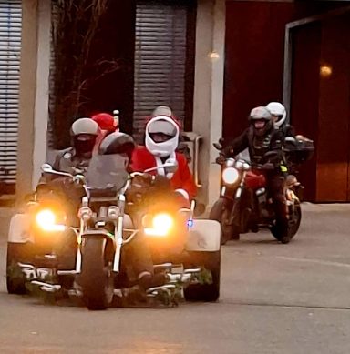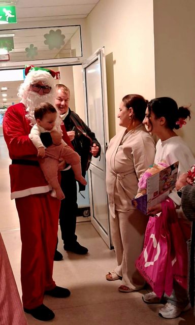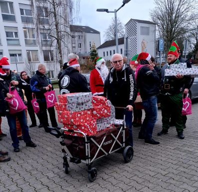 Mit dem Weihnachtsmann und auf dem Anlass entsprechend geschmückten Fahrzeugen fuhren wir zum Krankenhaus und überreichten den Kindern dort festlich verpackte Geschenke.